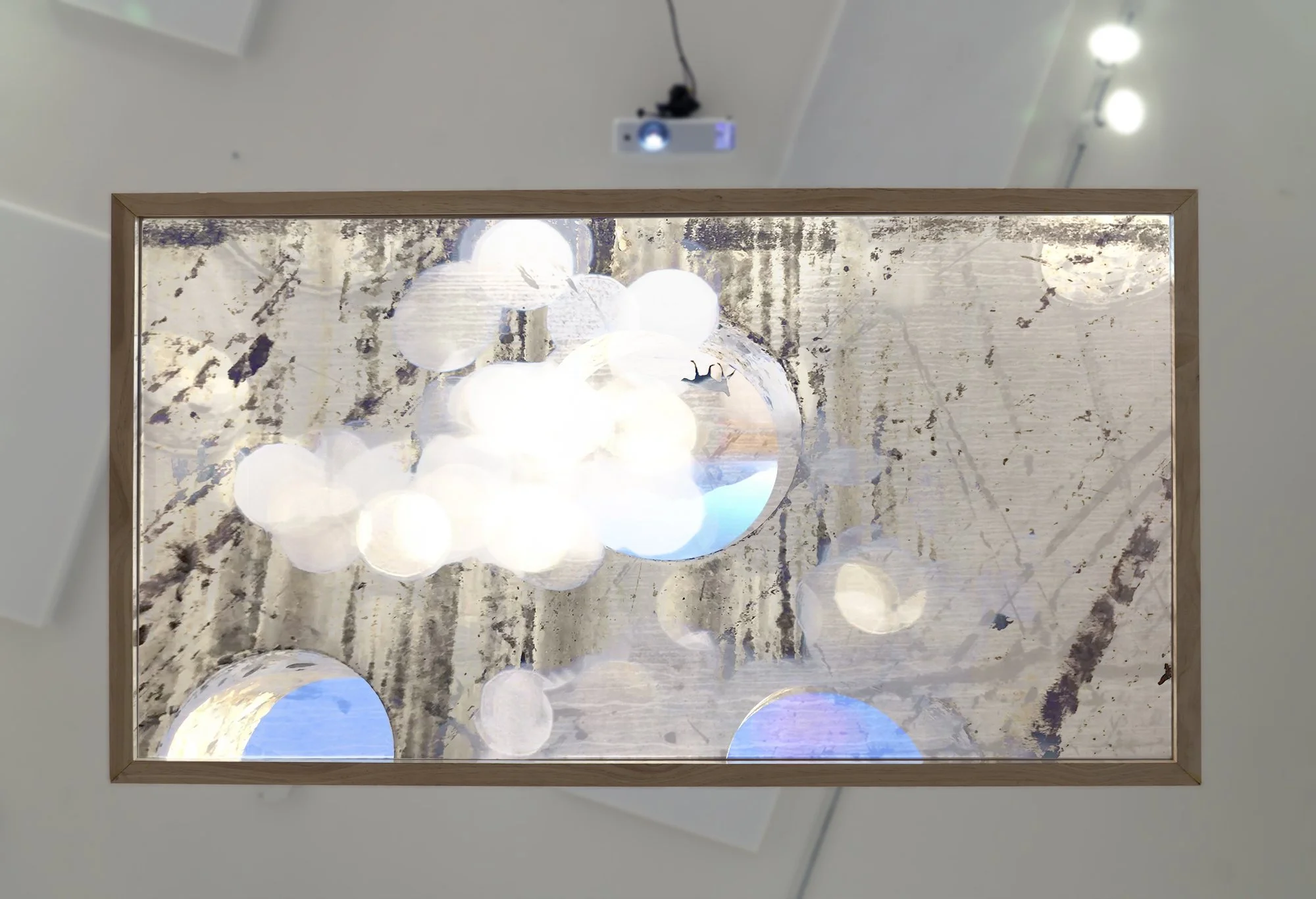 Memory foam, wood, plastic screen, rear-projected HD video, floor: 70 x 55 x 20 in., ceiling drop: 65 x 38 x 32 in., 2021